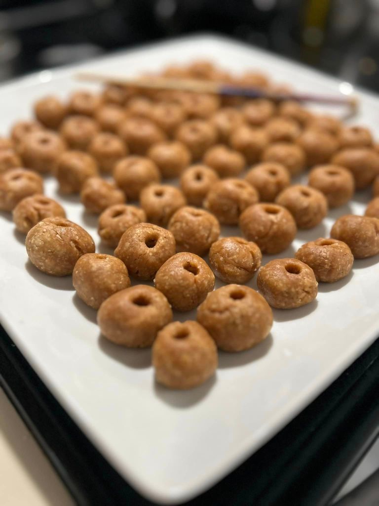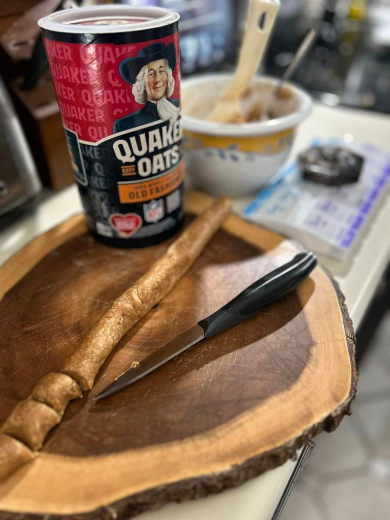 If you blend the ingredients together in these proportions, you will then be able to create a dough. I work it though with my hands after it is mixed. Most recipes go right to “rolling them into small dough balls” from there. I have learned that a time saving trick is to roll portions of the dough into a cylinder “snake” (which brought back memories of playdough playing with the human kids in past years). After rolling the cylinder until it is about an inch in diameter, using a sharp knife I cut the “snake” into small about 1″ to 2″ pieces to portion out the pockets. From there, it is simple enough to roll into a ball and make a pocket with a utensil. You can use the end of a chopstick, the end of a meat thermometer, or the end of a BBQ skewer to do this. Really anything that you can manipulate the treat with, to work a hole part way through in the center, will work. Also, I have learned this step is not really necessary, if you’d like to skip it, because you end up just forming the dough around the pill in the end.
