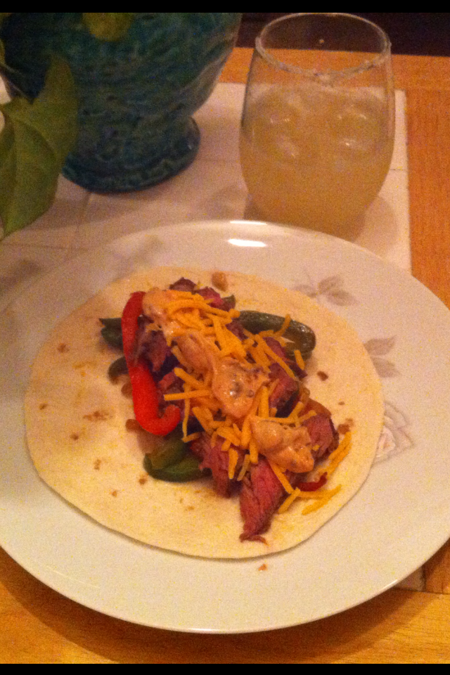 I will add recipes throughout the week for this menu. Tonight’s meal? The Beef Fajitas. I had a New York Sirloin in the freezer that was on sale a week or two ago…it was soooo tender! The kids gobbled this up, although they opted for regular sour cream as opposed to my spicy lightened up version. I had a mini margarita to accompany my little Mexican dish. Every one was happy!